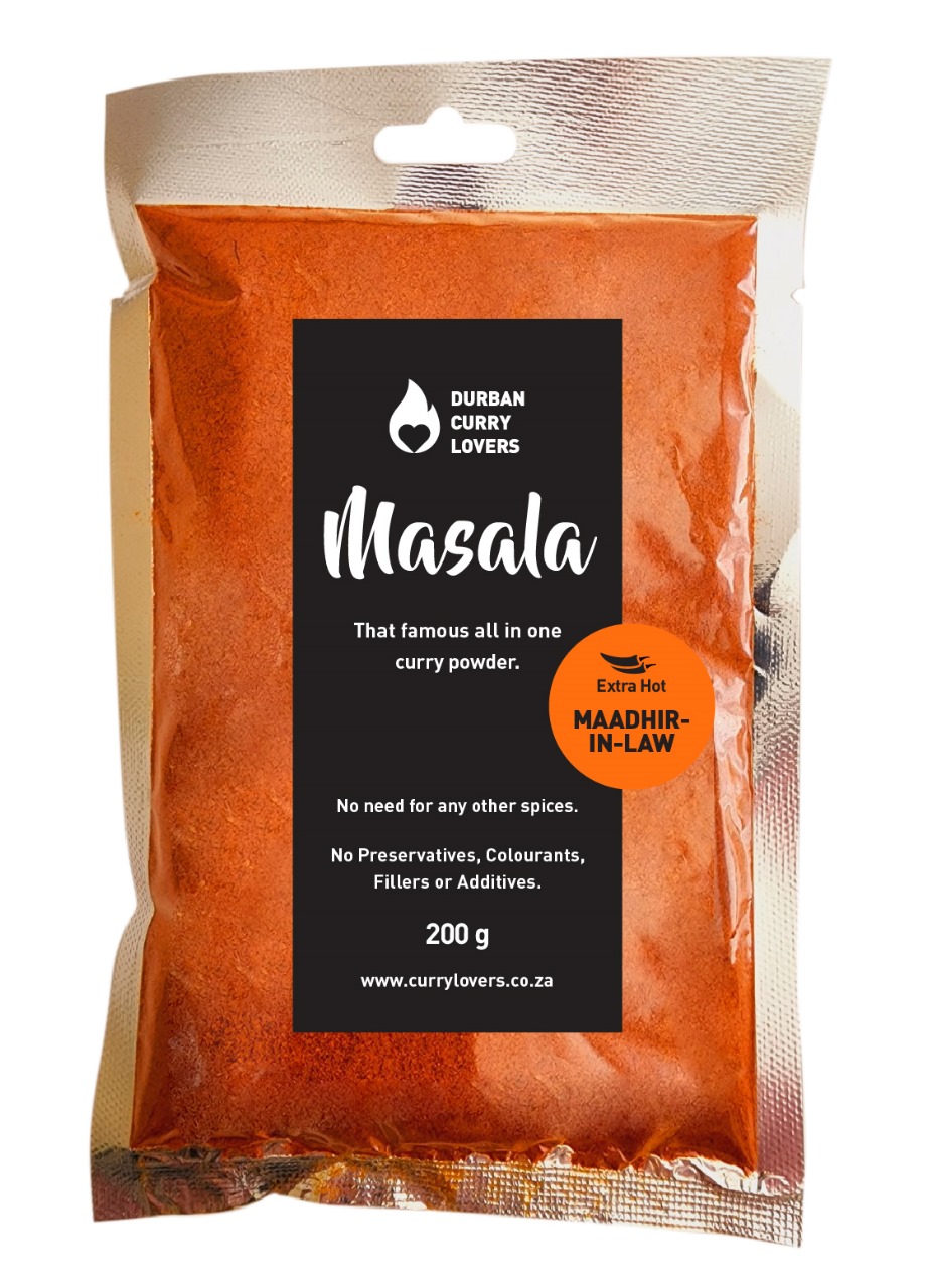 Not for the faint-hearted. Durban Curry Lovers Extra Hot All-in-One Masala, affectionately known as The Maadhir-in-Law, delivers uncompromising heat with the deep, authentic flavour Durban curry is famous for.